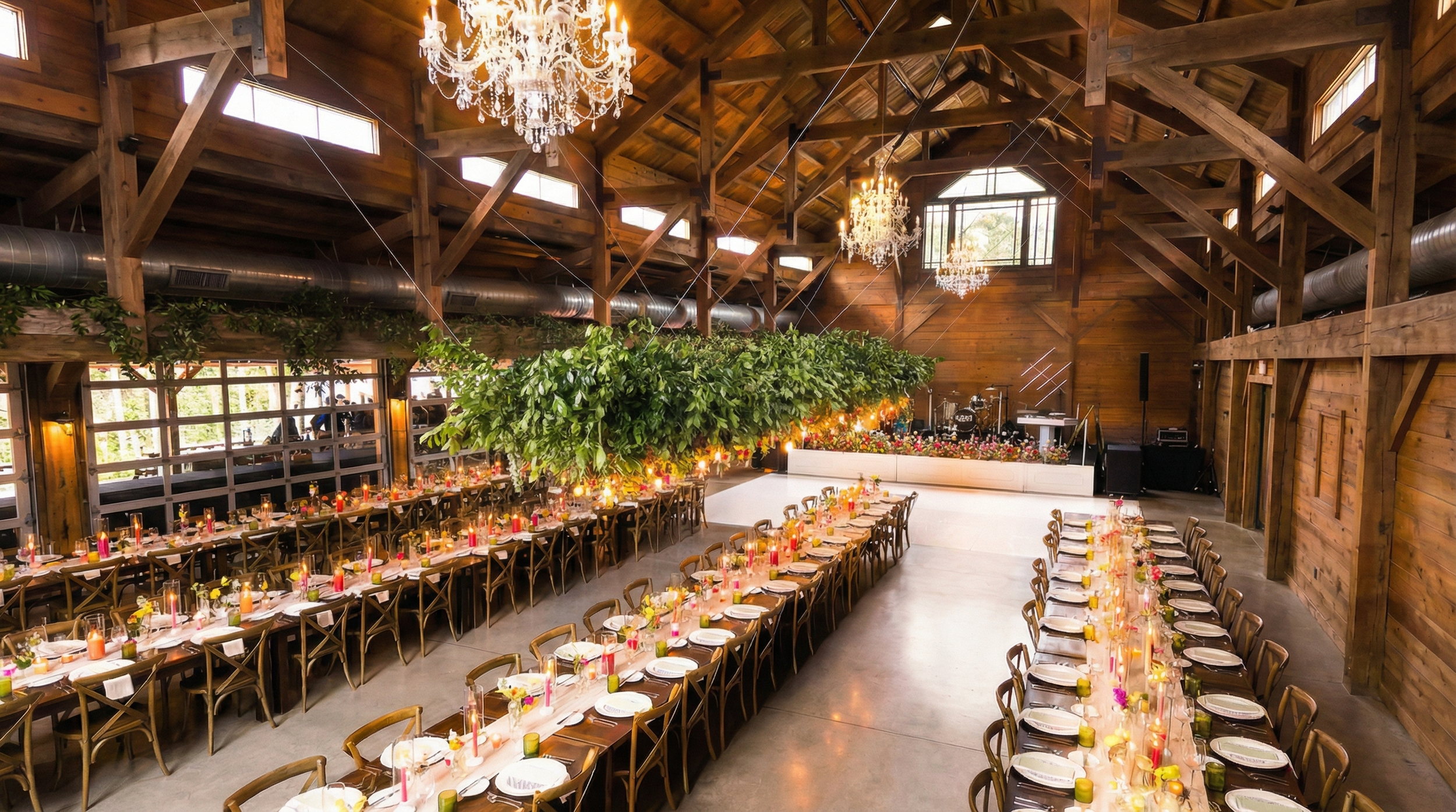 • The Barn — Reception space with exposed wood beams, string lights, and a dance floor that photographs beautifully.