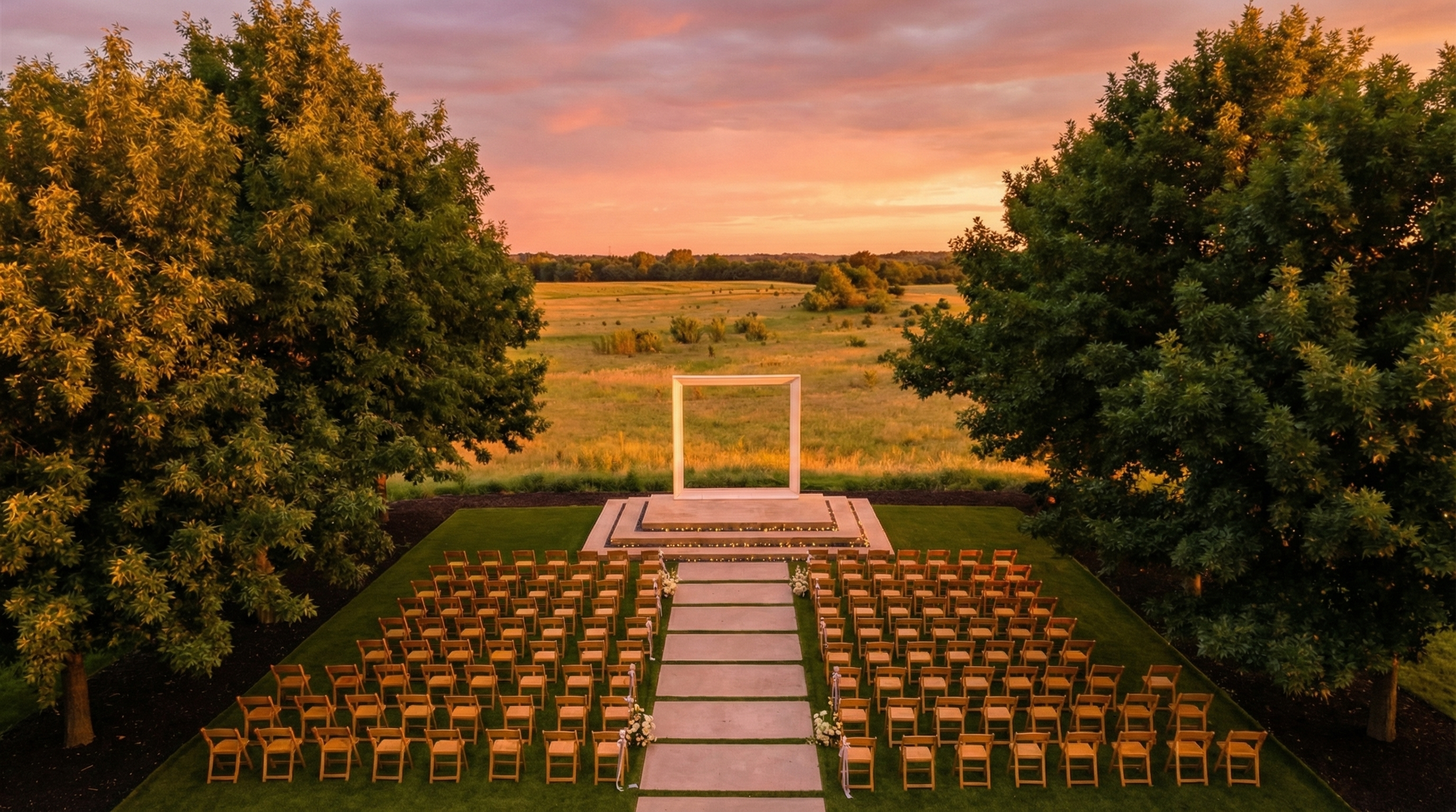 The outdoor ceremony site faces west, which means late afternoon ceremonies get backlit in the most flattering way. Your guests are in shade, you're in soft light, and the rolling hills are behind you. Cinematically, it's perfect.